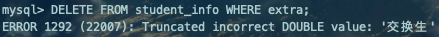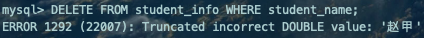 结果:执行报错,ERROR 1292 (22007): Truncated incorrect DOUBLE value: '赵甲',数据不会被删除。
