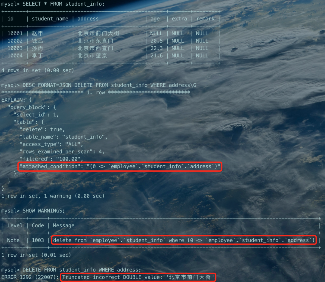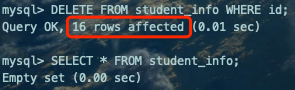 DESC FORMAT=JSON DELETE FROM student_info WHERE address\G