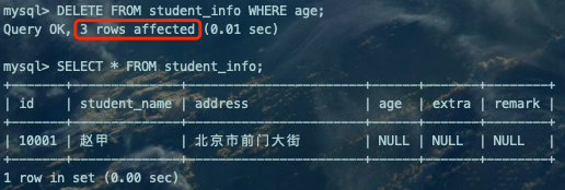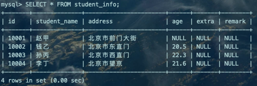 ALTER TABLE student_info ADD COLUMN age DOUBLE DEFAULT NULL AFTER address;INSERT INTO student_info (id, student_name, address, age, extra, remark) VALUES(10001, '赵甲', '北京市前门大街', NULL, NULL, NULL);INSERT INTO student_info (id, student_name, address, age, extra, remark) VALUES(10002, '钱乙', '北京市东直门', 20.5, NULL, NULL);INSERT INTO student_info (id, student_name, address, age, extra, remark) VALUES(10003, '孙丙', '北京市西直门', 22.3, NULL, NULL);INSERT INTO student_info (id, student_name, address, age, extra, remark) VALUES(10004, '李丁', '北京市望京', 21.6, NULL, NULL);SELECT * FROM student_info;