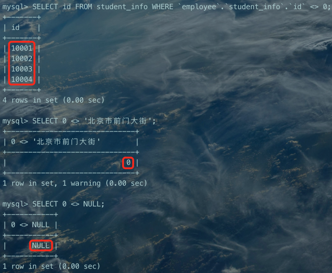 SELECT id FROM student_info WHERE `employee`.`student_info`.`id` <> 0;SELECT 0 <> '北京市前门大街';SELECT 0 <> NULL;