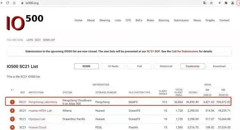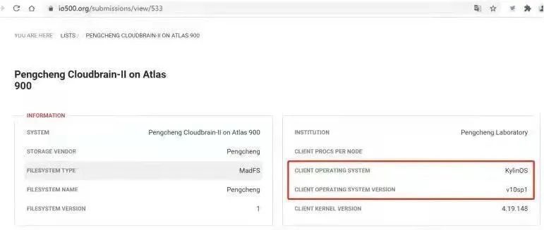 2021年11月18日,国际SC21发布了新一期国际IO500排行榜,由鹏城实验室与优势科技力量联合研制,运行在银河麒麟高级服务器操作系统V10上的“鹏城云脑II”人工智能大科学装置,以极具优势的评测分数连续第三次获得IO500全系统榜和10节点规模榜两项世界冠军,有力展示了世界顶尖水平的AI算力和数据吞吐能力。