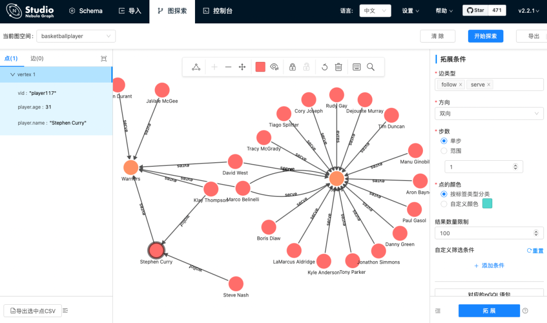下图就是这个图谱的可视化探索截图,可以看到左边的中心节点勇士队(Warriors)