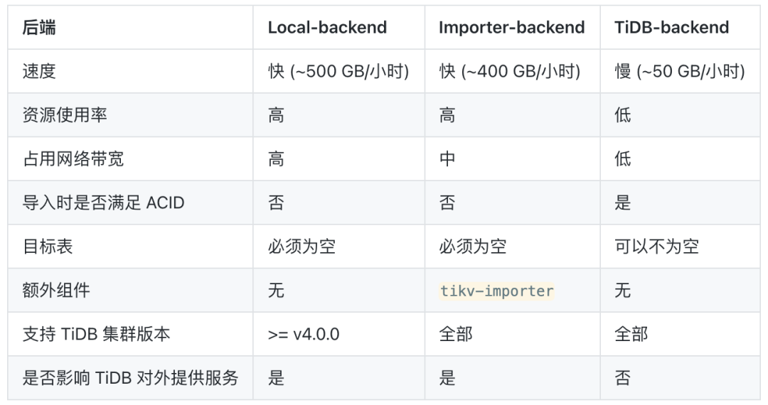 对应PostgreSQL中的pg_bulkload或者是Oracle中的impdp。它可以选择物理方式进行导入,也可以选择逻辑方式进行导入。因为TiKV底层存储的SST文件,物理方式的原理是将数据编码成键值对并排序,接着存储在本地临时目录,然后将这些键值对以 SST 文件的形式上传到各个 TiKV 节点,最后由 TiKV 将这些 SST 文件 Ingest 到集群中,这样做的好处是速度特别快,但是缺点是占用资源高、目标表必须为空、还不支持ACID,最最重要的是它影响TiDB对外提供服务。而逻辑方式直接以SQL进行导入,这样就必须经过SQL解析层,因此它是最慢的,但是它的优势是消耗资源低、且可以让目标表不为空、同时还支持ACID、不影响TiDB对外提供服务。所以我们可以按照实际需求来选择导入模式。