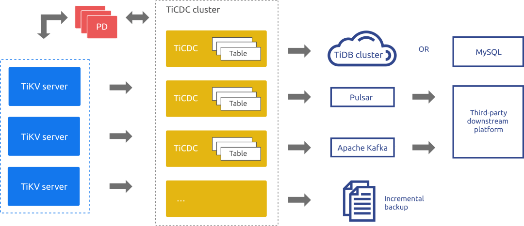 TiCDC 是一款通过拉取 TiKV 变更日志实现的 TiDB 增量数据同步工具,它其实有点像GoldenGate