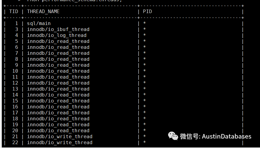 SELECT THREAD_ID AS TID, SUBSTRING_INDEX(NAME, '/', -2) AS THREAD_NAME, IF(TYPE = 'BACKGROUND', '*', ") AS B, IFNULL(PROCESSLIST_ID, ") AS PID FROM performance_schema.threads;
