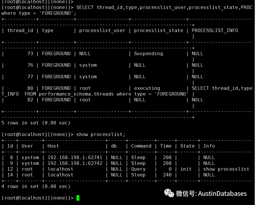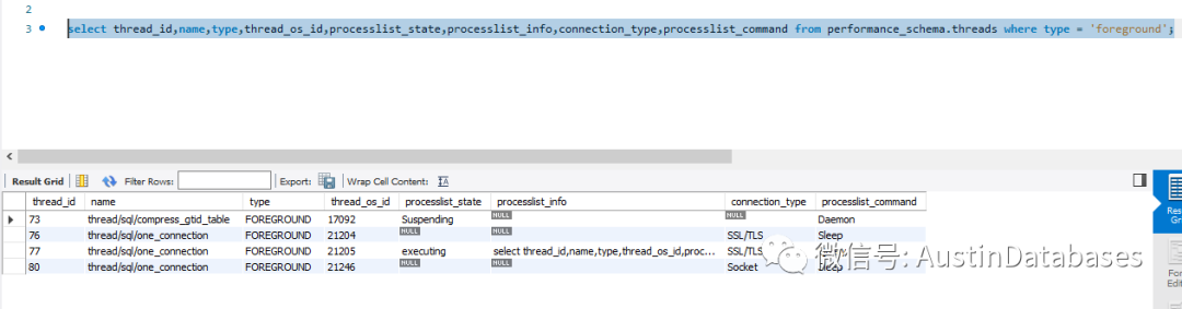 SELECT thread_id,type,processlist_user,processlist_state,PROCESSLIST_INFO FROM performance_schema.threads where type = 'FOREGROUND'