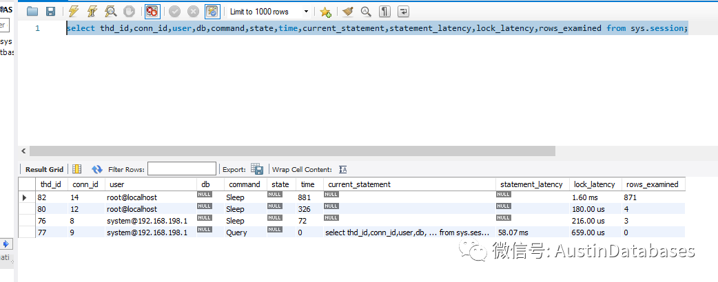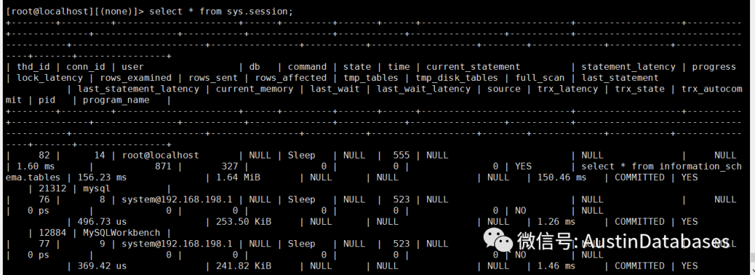 select thd_id,conn_id,user,db,command,state,time,current_statement,statement_latency,lock_latency,rows_examined from sys.session;