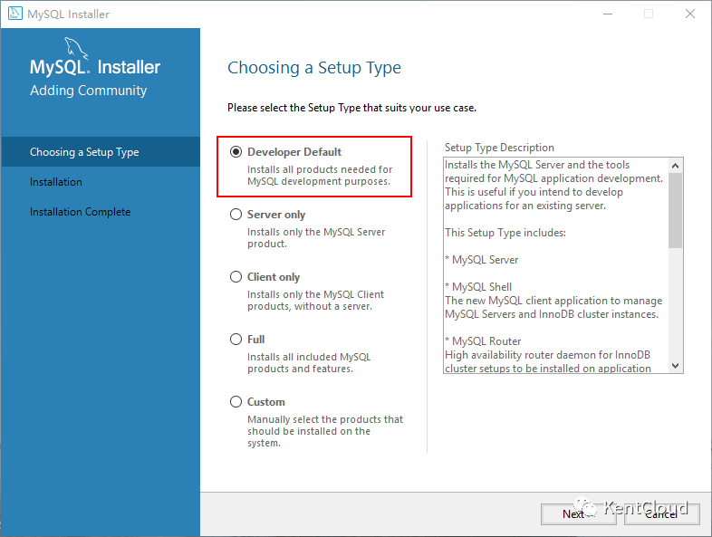 有的会直接进入“Choosing a Setup Type(安装类型选择)”窗口,根据右侧的安装类型描述文件选择适合自己的安装类型,这里选择默认的安装类型,如图所示。