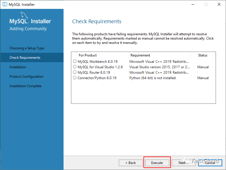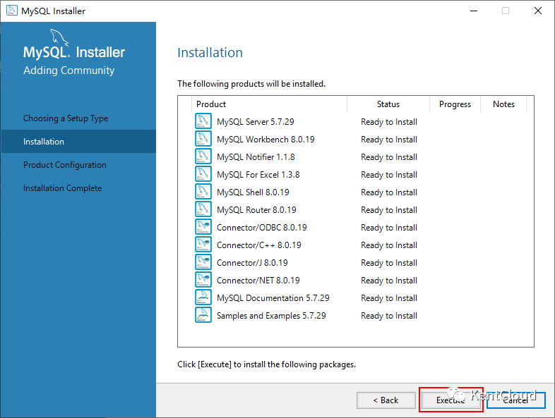 步骤 6):进入安装确认窗口,点击 Execute 按钮,开始 MySQL 各个组件的安装,如图所示。