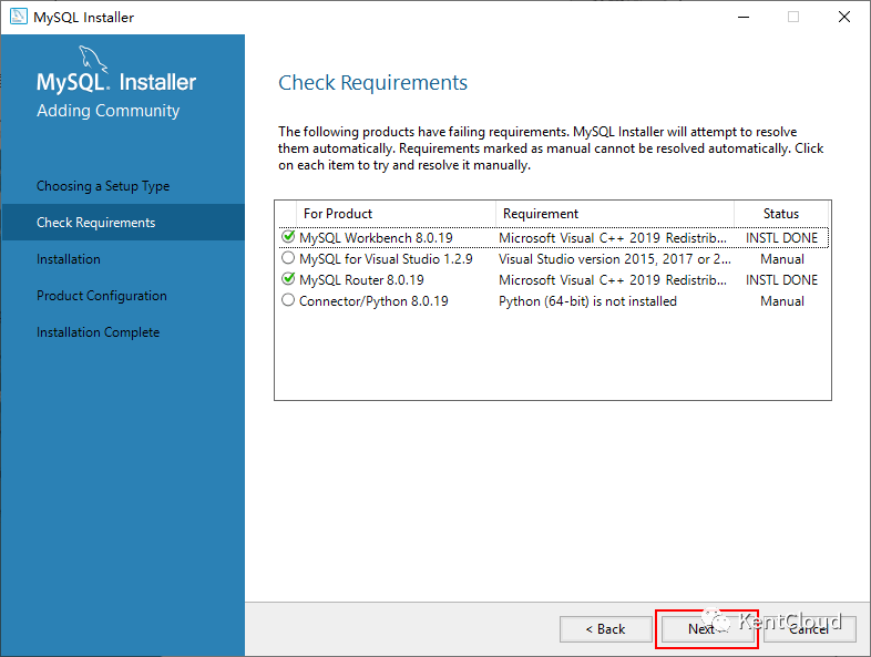 步骤 5):安装完成后会在【status】列表下显示 Complete(安装完成)。所需框架均安装成功后,点击 Next 按钮,如图所示。