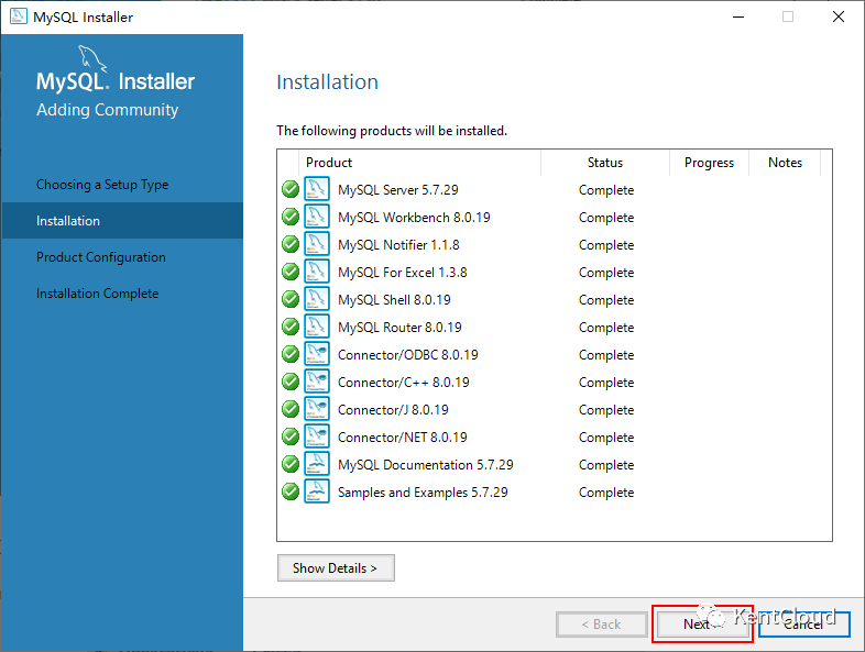 步骤 7):开始安装 MySQL 文件,安装完成后在【Status】列表下显示 Complete,如图所示。