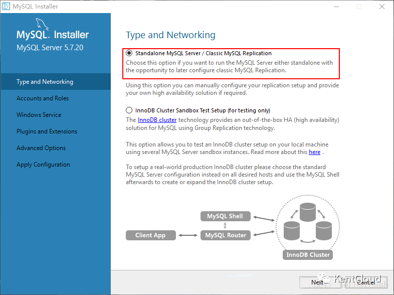 步骤 2):进入 MySQL 网络类型配置窗口,采用默认设置,点击 Next 按钮,如图所示。