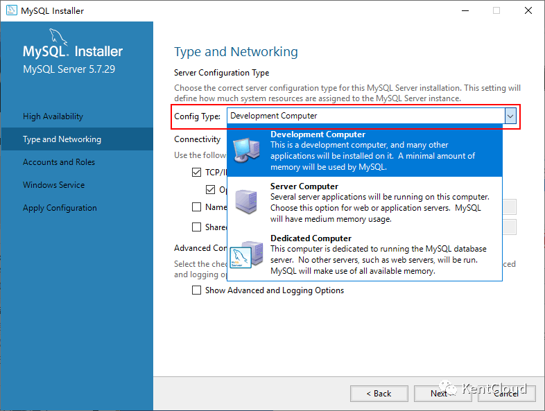 Development Machine(开发机器):安装的 MySQL 服务器作为开发机器的一部分,在三种可选的类型中,占用的内存最少;