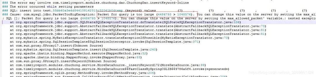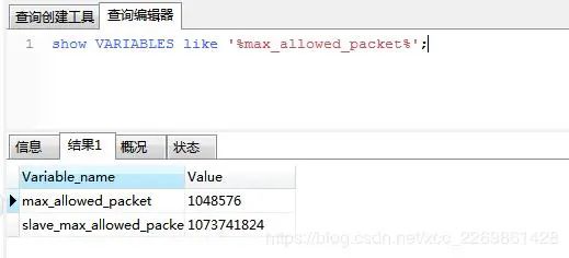 1048576字节=1M,也就是mysql默认的。那么问题来了,我是修改这个参数,还是另寻其它解决办法。我选择了最后一个。原因: