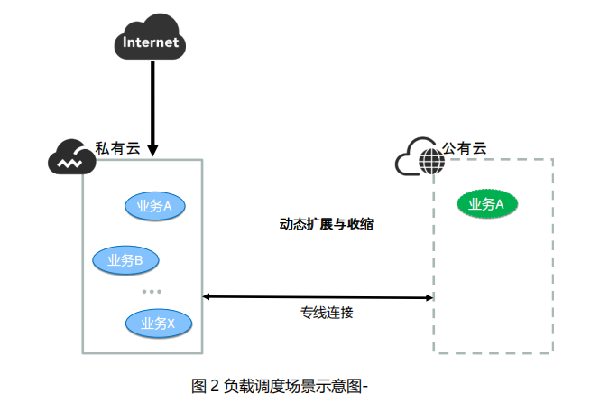 负载调度场景下采用混合云架构的根本目的是在满足快速变化的业务需求的基础上实现成本的优化。因此,通常会将应用部署在私有云里,仅维持满足日常服务需求的算力。当遇到某一特定时期应用访问或使用突然增加,而企业无法快速添置硬件扩展私有云容量去适应这变化时,混合云平台可以通过公有云来弥补暂时的容量不足,达到调峰目的。