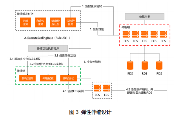 弹性伸缩方面,需要能够根据用户的需求和策略,自动调整计算资源的大小。混合云平台的监控模块将实时监控伸缩组内实例的性能和健康状况,一旦业务量上升,实例性能达到某一阈值,便按照预先配置的伸缩任务和规则在公有云上创建和部署新的实例。规则的内容将包括实例的数量、类型以及配置等。之后随着业务量下降,伸缩组也可以根据监控信息,弹性的减少实例。