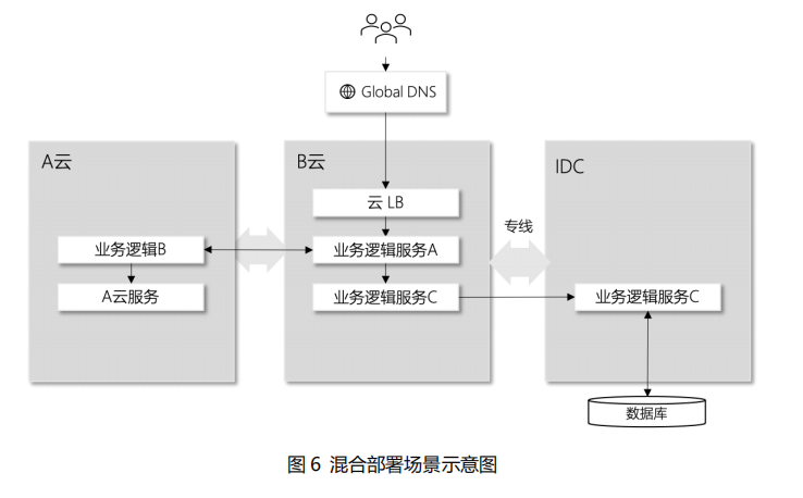 常见的混合部署形态为,将敏感数据层和对数据延时有高要求的业务模块放在 IDC,将应用接入层、应用逻辑层放在公有云就近地域。与此同时,应用的一些依赖服务、或者上下游服务可以部署在另一个云厂商公有云。多个数据中心通过专线连接,内网访问,以保障安全性和网络稳定性。