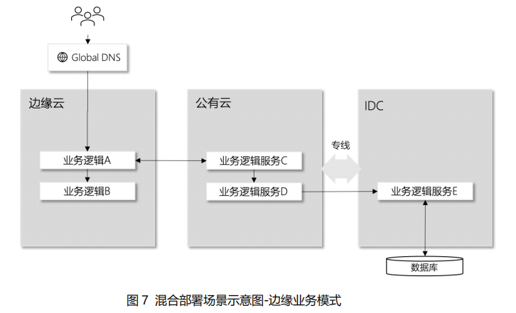 混合部署的另一种形式是边缘业务,边缘业务是典型的弱网络场景,业务逻辑运行在边缘设备,并将边端数据上报到公有云的中心管控,特征是业务逻辑相对闭环,且本身具备较强的容错能力,因此边端和中心管控之前可以无需专线。用户通过智能 DNS 解析接入到就近的边端设备,中心管控负责管控边缘设备,分发指令、汇总数据,IDC 的数据服务负责数据价值挖掘。