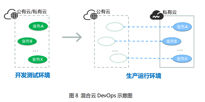 实际部署中,可以将业务的开发测试环境及开发云资源池部署在公共云上,利用公有云按需使用和快速部署能力满足开发测试过程中不断变化的需求;与此同时,用户的核心业务和关键系统生产环境及生产云资源池则可以部署在私有云上,保障业务的稳定的运行。