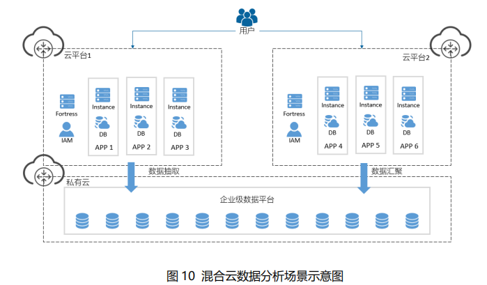 在整体架构中,通过不同云平台的业务数据可通过主动抽取和汇聚导入的方式,集合到一个可控的数据云平台,此平台可以在公有云或私有云环境中,但鉴于企业对于数据安全和合规的要求,建议使用私有云环境作为数据云平台。