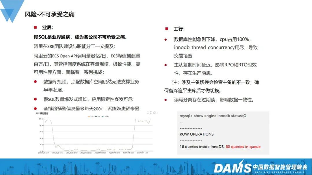 首先介绍MySQL的痛点。因为MySQL是免费的,所以我们在使用过程中必须承担它所带来的风险,换句话说,这就是生命中不可承受之痛。比如慢SQL在业界就算是一种通病,不论哪个公司,只要用了MySQL数据库,慢SQL就必然是所有问题的重中之重。