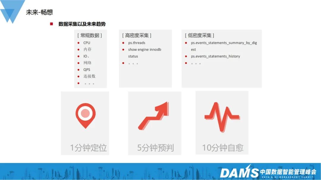 十分钟自愈这部分算是我们对未来的期望,我们希望未来在发现问题以后,系统可以直接自行处理。这部分其实我们现在在做的一些自动化运维可以达到这个要求。比如当数据库发现问题以后,经过一些检测,自动进行主从切换。这其实也属于十分钟自愈的范畴。