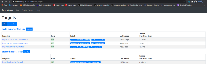 我创建了 3 个虚拟机并在所有虚拟机中安装了节点 exporter,以提供更好的可视化效果。所以在安装之后,我们必须告诉 Prometheus 从哪里抓取指标,这可以通过编辑 prometheus.yml 文件来完成。我们只需要在 scrape_configs 中添加一个新作业,指定目标中的 IP 地址和端口。在 prometheus.yml 文件中添加目标并重新启动 Prometheus 服务器后,我们可以在仪表板以及 /targets 路径中看到新目标及其状态。