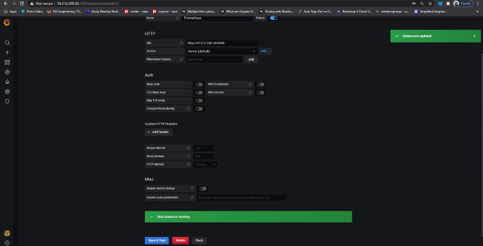 当我们进入仪表板,我们需要添加一个数据源,在我们的例子中是 Prometheus。我们只需要提供 Prometheus URL 并点击保存和测试按钮。如果我们看到一个成功的提示框,说数据源正在工作,那么我们就可以开始了。