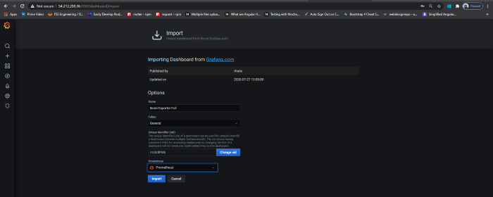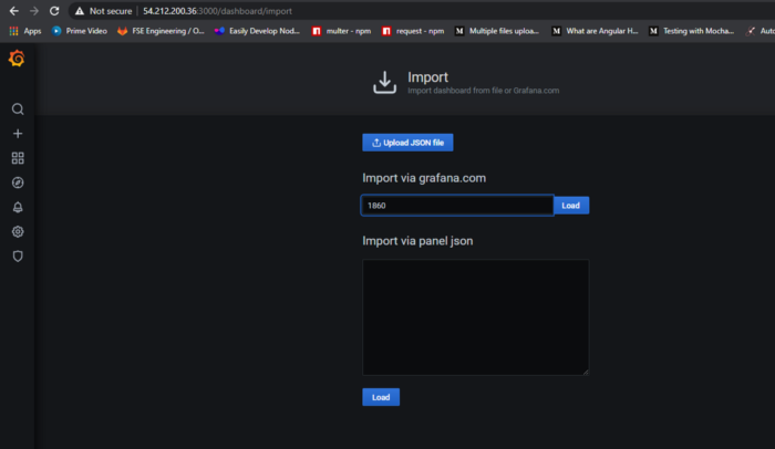 我们可以使用自定义的查询语句创建自己的仪表板和面板,但这是一项乏味的工作。因此,为了简化我们的工作,其他用户已经创建了一些仪表板,我们可以使用相同的仪表板并根据我们的需要调整表达式。我使用的是 1860 和 405,这些是我们导入仪表板的唯一ID。