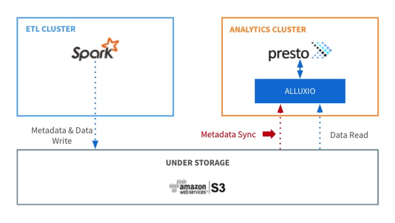 上图是一个典型的场景,该数据工作流同时使用了Spark ETL和Presto SQL。ETL集群(未部署Alluxio)写入数据,然后由部署了Alluxio的分析集群读取转换后的数据。由于Alluxio维护底层存储中的元数据副本,并对元数据进行管理,所以当底层存储的数据经过ETL步骤发生变化时,必须让分析集群上的Alluxio实例感知到并与底层存储系统中的元数据保持一致,只有这样才能继续正常运行。
