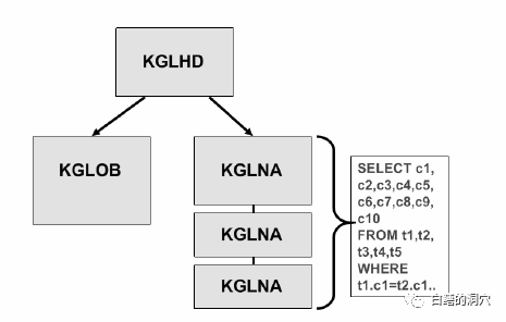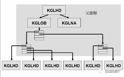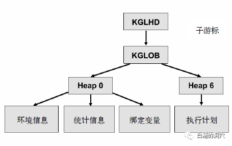下面这张图明确地显示了父游标和子游标之间的关系。父游标的KGLOB 中的KGLDA 里的某个列表中存放了子游标的句柄(KGLHD)指针。对于子游标的结构,Dyke 也有一张很棒的图示: