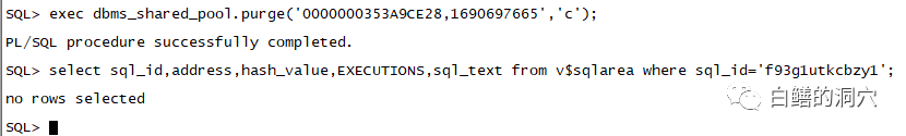 这时候我们就知道,这条SQL的执行情况被很好的统计了。如果这时候我们把这条SQL对应的CURSOR PURGE掉,也就是说把这条SQL从共享池中清理出去,会发生什么情况呢?