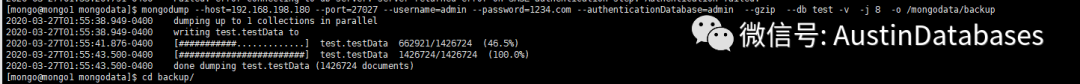 mongodump --host=192.168.198.180 --port=27027 --username=admin --password=1234.com --authenticationDatabase=admin --gzip --db test -v -j 8 -o mongodata/backup