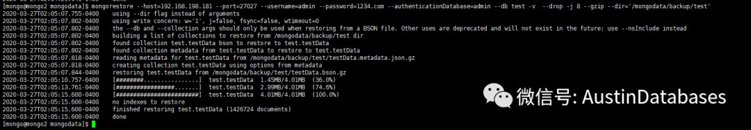 mongorestore --host=192.168.198.181 --port=27027 --username=admin --password=1234.com --authenticationDatabase=admin --db test -v --drop -j 8 --gzip --dir='/mongodata/backup/test'