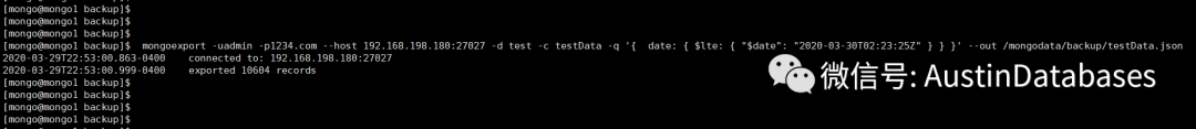 mongoexport -uXXX -pXXXXX --host 192.168.198.180:27027 -d test -c testData -q '{ date: { $lte: { "$date": "2020-03-30T02:23:25Z" } } }' --out mongodata/backup/testData.json