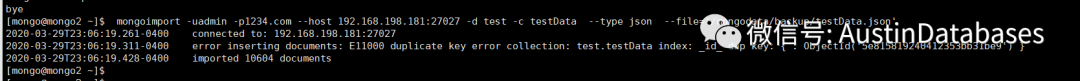 mongoimport -uXXX -pXXXXX --host 192.168.198.181:27027 -d test -c testData --type json --file='/mongodata/backup/testData.json'