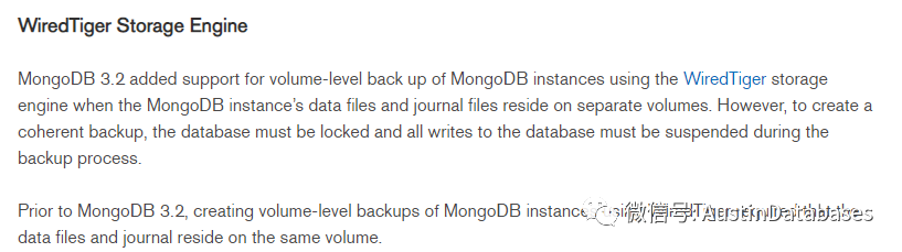 在回到备份,如果你的数据库比较大,通过这样的方法来进行备份,那就.... 比较慢,是不是有更好的方式来对数据库进行备份,由于MONGODB 本身不具有强事务性,所以在MONGODB 备份中会经常用到这样一个命令,从MONGODB 3.2开始,就支持卷备份了。
