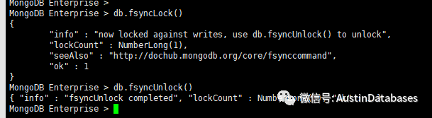 就是下面这个命令了,在db.fsyncLock() 将你的MONGODB 的写锁住,然后就可以开始拷贝你的文件了,将你的文件都拷贝走,当然你可以LVM 等方式,具体的按你心愿,
