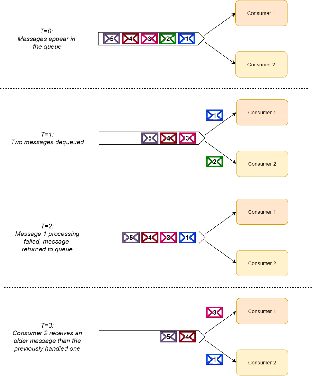 由于消费者读取消息之后可能会把消息放回(或者重传)到队列中(例如,处理失败的情况),这样就会导致消息的顺序无法保证。