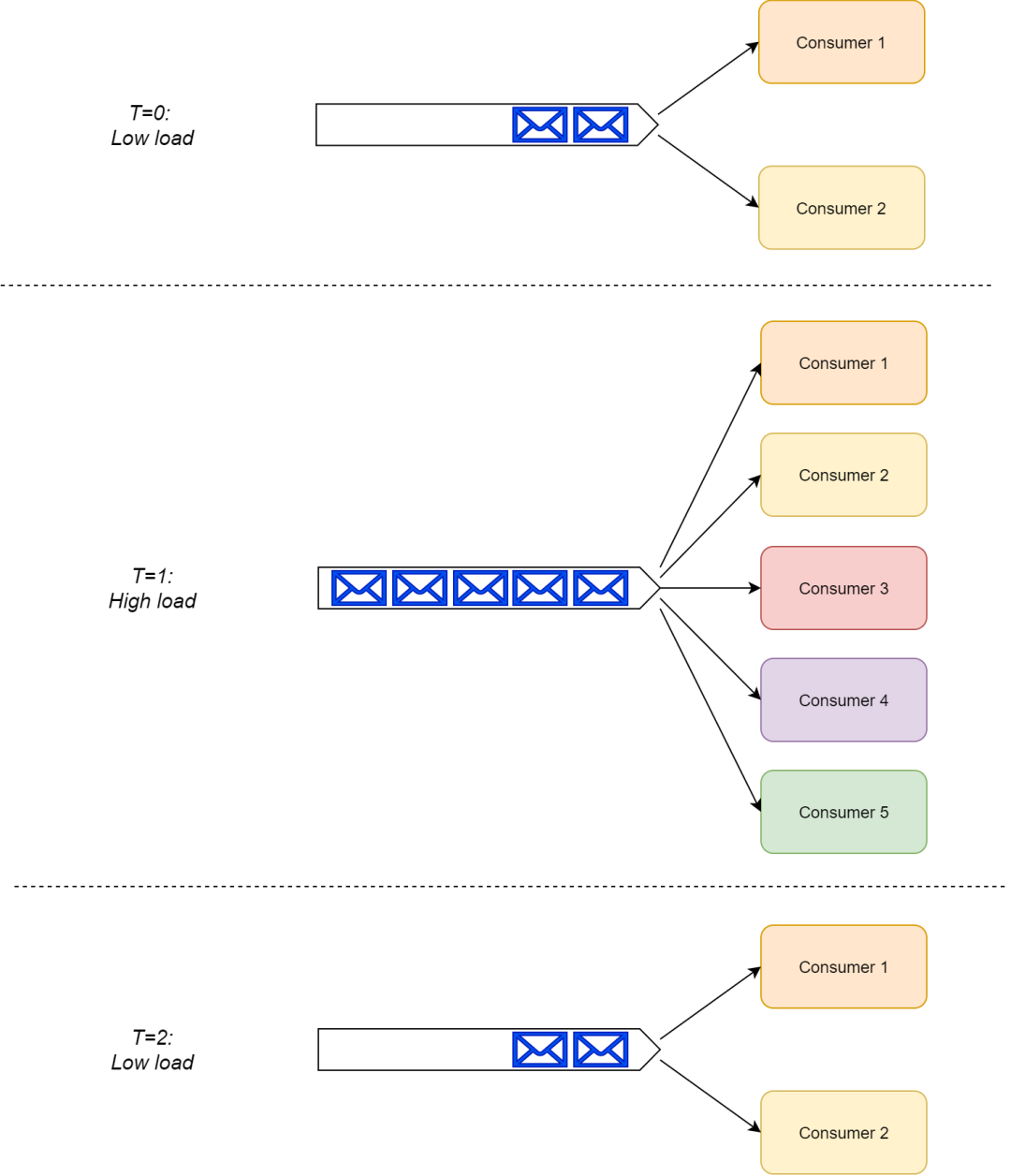 根据 RabbitMQ 结构的设计,当负载增加的时候,一个队列上的消费者组可以有效的从仅仅一个消费者扩展到多个消费者,并且不需要对系统做任何的改变。