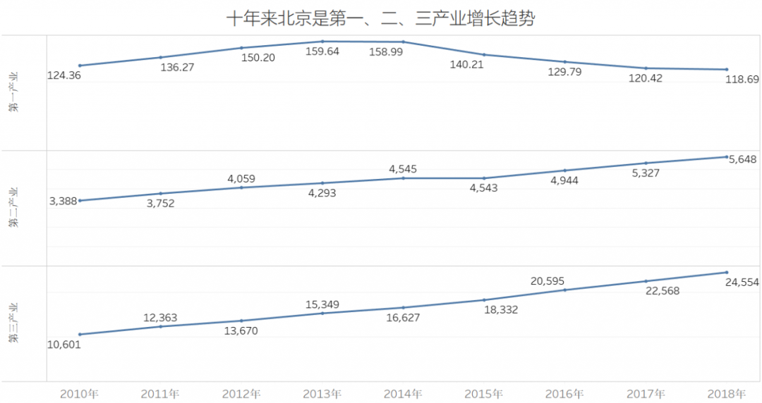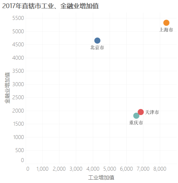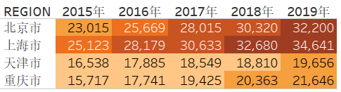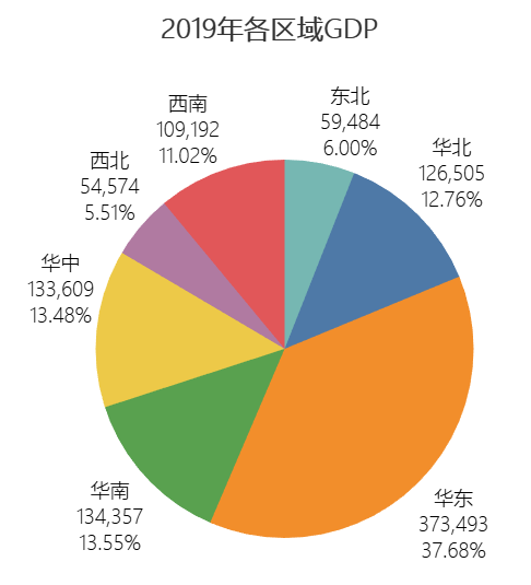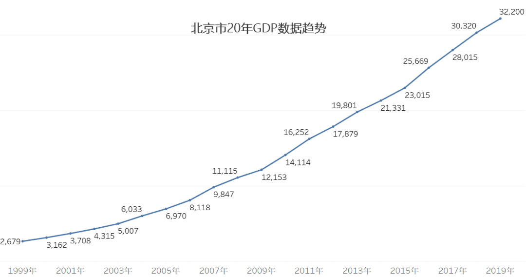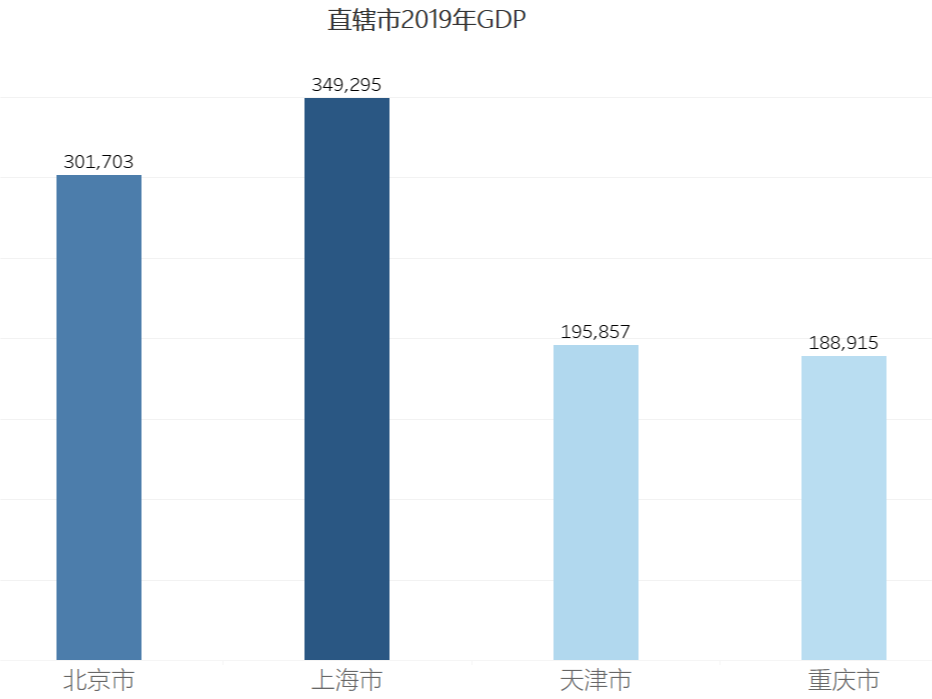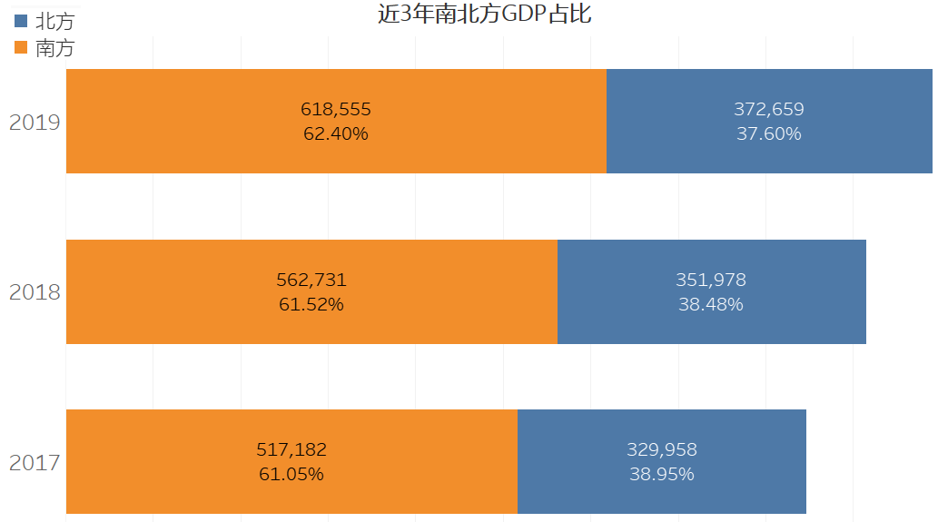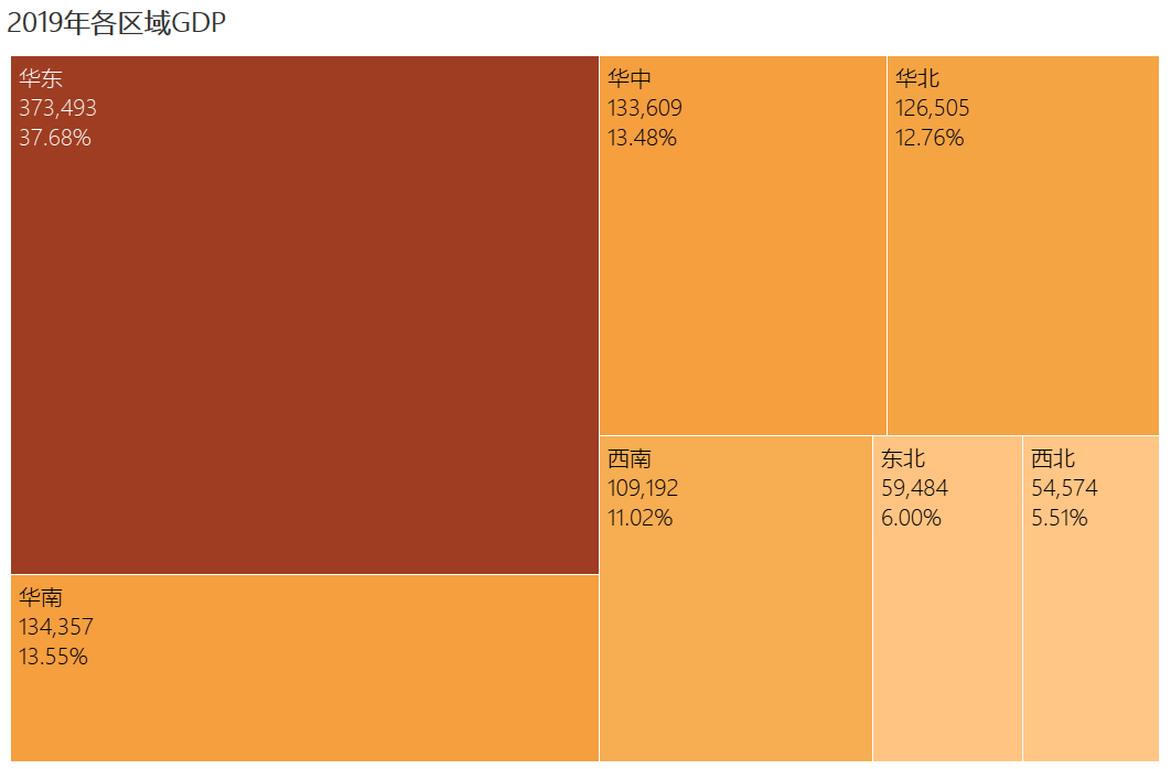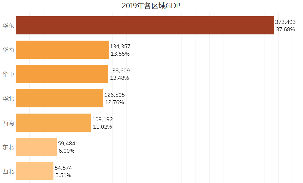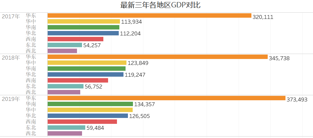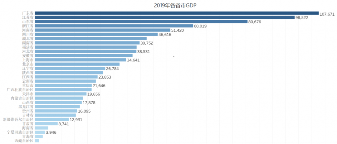 上面在一张图中展示31个省市自治区的GDP数据,使用条形图展示就非常合适。上图还使用了两个常见的条形图技巧。一个数值排序,这样有利于受众数值对比,二是使用了色温显示进一步加强了对比。