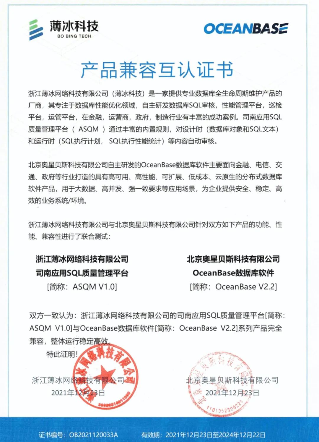 Oceanbases数据库软件完成兼容性认证