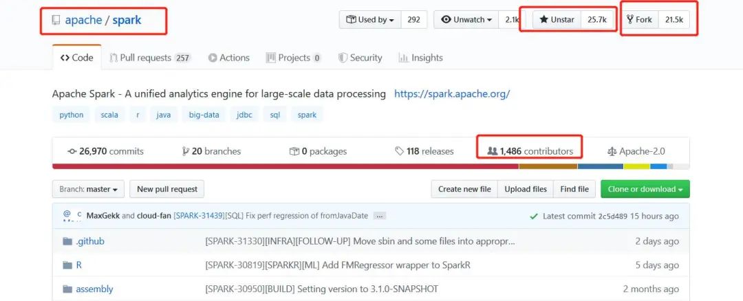 诞生于 2009 年的 Apache Spark,目前已成为全球范围内最流行、功能最全面、社区最活跃的大数据处理技术。在所有大数据处理技术中排名第一,在Github开源项目上面获得关注25.7k个star,共有1486位贡献者的参与(数据统计至20200415)。
