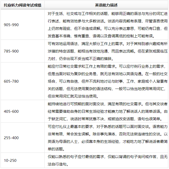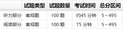 托业听力阅读考试采用纸笔考试的形式,成绩由考生回答正确的试题数量决定。答错不扣分。听力和阅读部分的正确答案数量将分别转换成一个介于5~495分区间的分值,总分为10~990分。