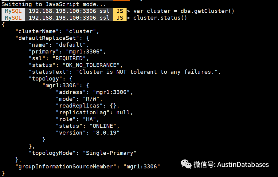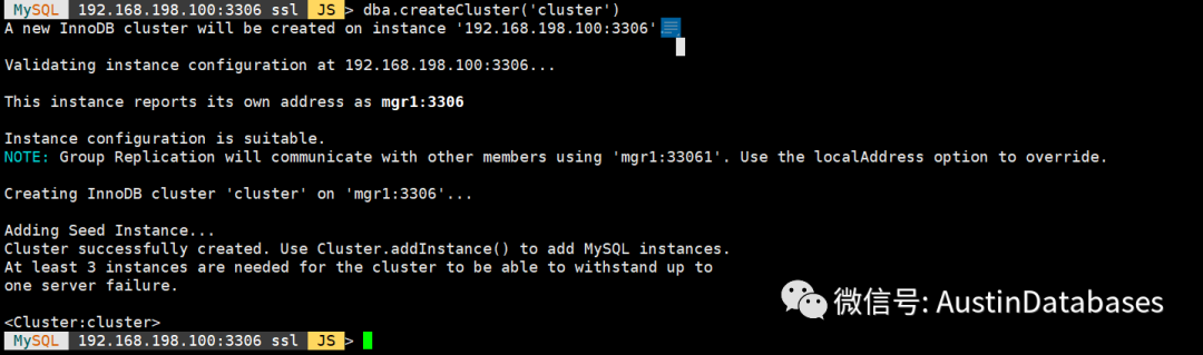 dba.createCluster('cluster') 通过这个命令我们开始建立我们的 innodb cluster