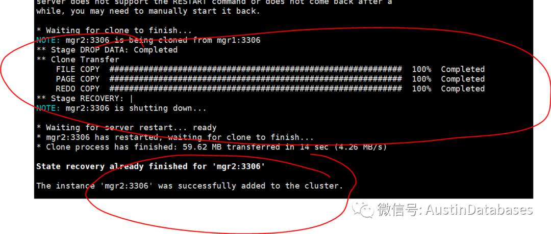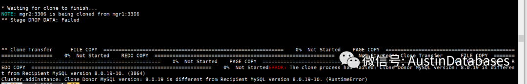 按照文档,下面我们直接使用cluster.addInstance('admin@mgr2:3306'),将第二个节点加入到集群中。
