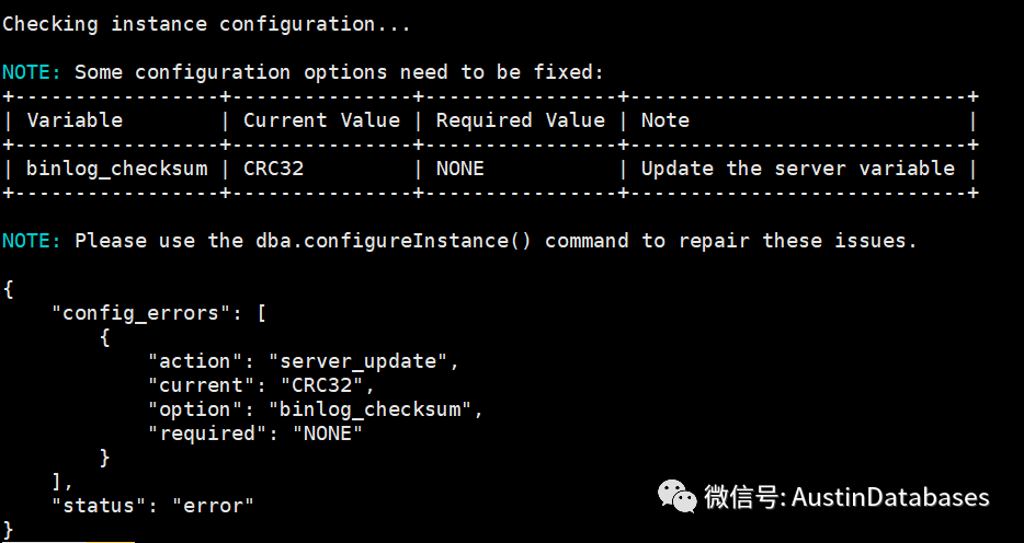 我们可以很明显的看出来,我当前如果要使用 innodb cluster 中在配置有一个错误,我的 binlog_checksum 当前的设置是有问题的。我需要将其改为none