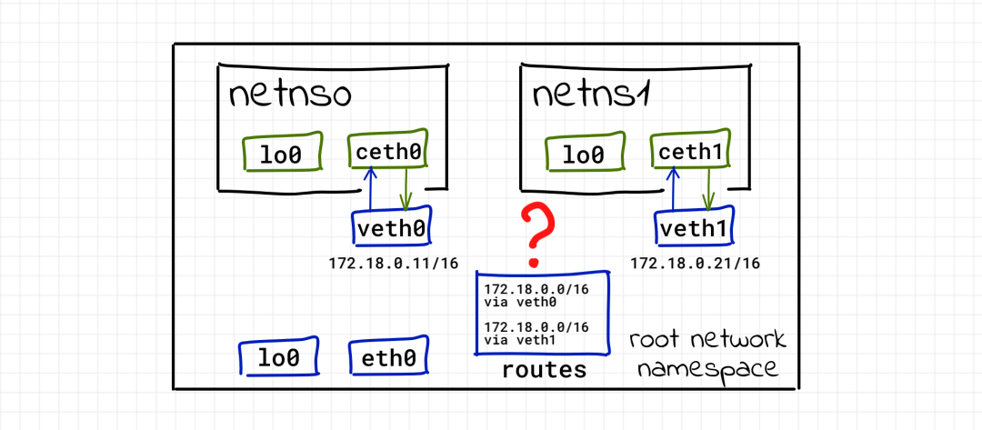 一旦启用设备并且分配了合适的IP地址,其中一个设备上产生的包会立刻出现在其配对设备里,从而连接起两个命名空间。从root命名空间开始: