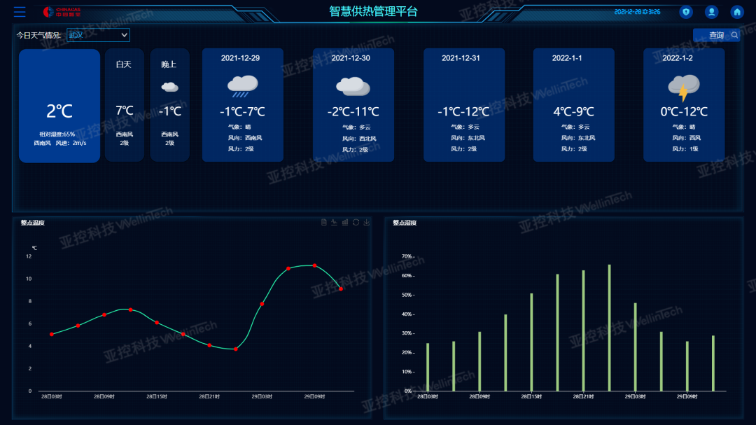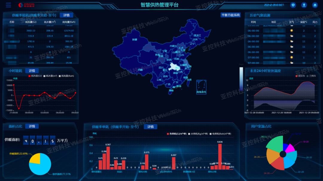 中燃暖居智慧供热管理系统平台,融合过程控制、现场操作、能源管理、负荷预测、热网调控于一体,通过远程通讯对各换热站的运行数据及集团管理数据进行采集、存储,实现对数据的分析,并根据数据和相应的控制策略对各换热站的运行进行调控,对管理进行调度指挥,把数据信息转换成直观、生动、可视化的图形界面和报表,方便对生产运营状况的掌控和管理,实现热网自动控制,换热站无人值守。达到全网热量平衡,安全节能运行,优质高效服务和科学规范化的管理。