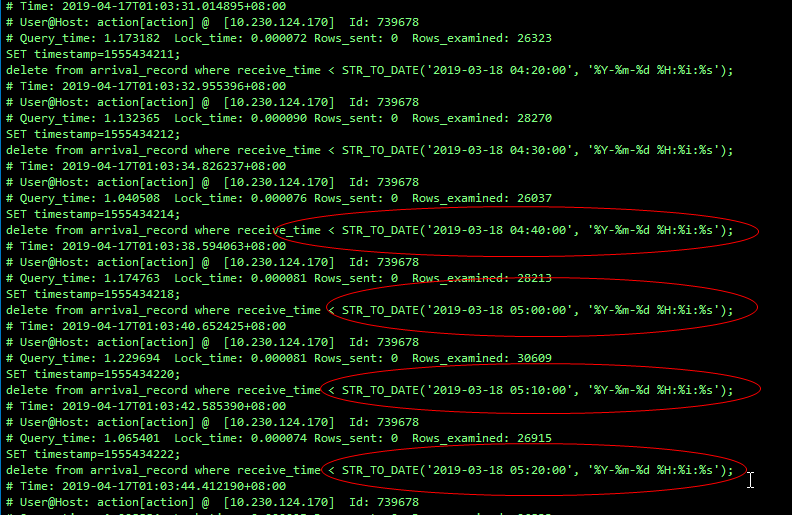 delete 语句如下所示,每次记录的慢查询传入的参数值不一样: